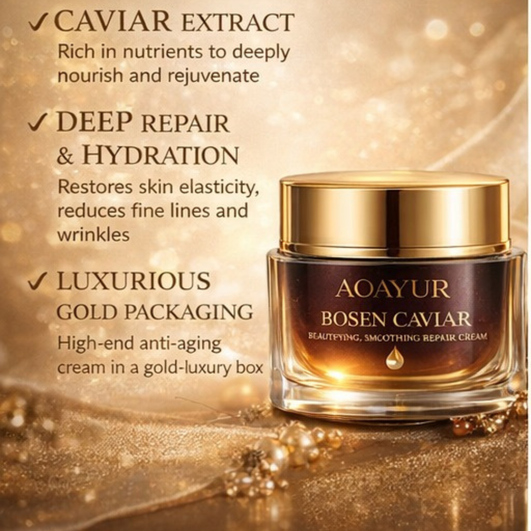 Experience refined skincare with AOAYUR Bosen Caviar Beautifying Smoothing Repair Cream, a luxury multi-active formula infused with nutrient-rich caviar extract. Designed to smooth, firm, and rejuvenate the skin, this premium cream supports visible skin repair while enhancing softness, elasticity, and natural glow. Its silky, fast-absorbing texture delivers deep hydration without greasiness, leaving the skin smooth, supple, and radiant. Perfect for daily use, this elegant gold-packaged cream elevates your skincare routine with a touch of sophistication and performance-driven care.