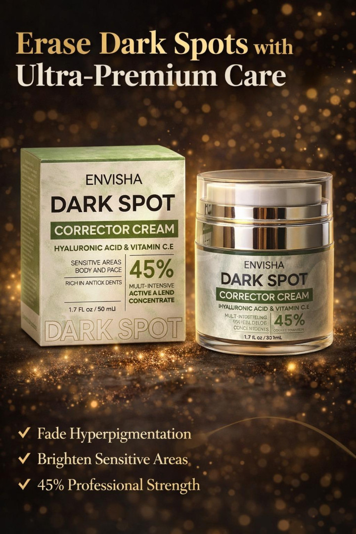 Reveal a clearer, more radiant complexion with ENVISHA Dark Spot Corrector Cream. This ultra-premium brightening formula is designed to visibly reduce dark spots, pigmentation, and uneven skin tone while deeply hydrating the skin. Enriched with Hyaluronic Acid for intense moisture and Vitamin C & E for antioxidant protection, the lightweight, fast-absorbing cream restores skin clarity, smoothness, and natural glow. Gentle yet effective, it is suitable for the face, body, and sensitive areas—ideal for daily luxury skincare.