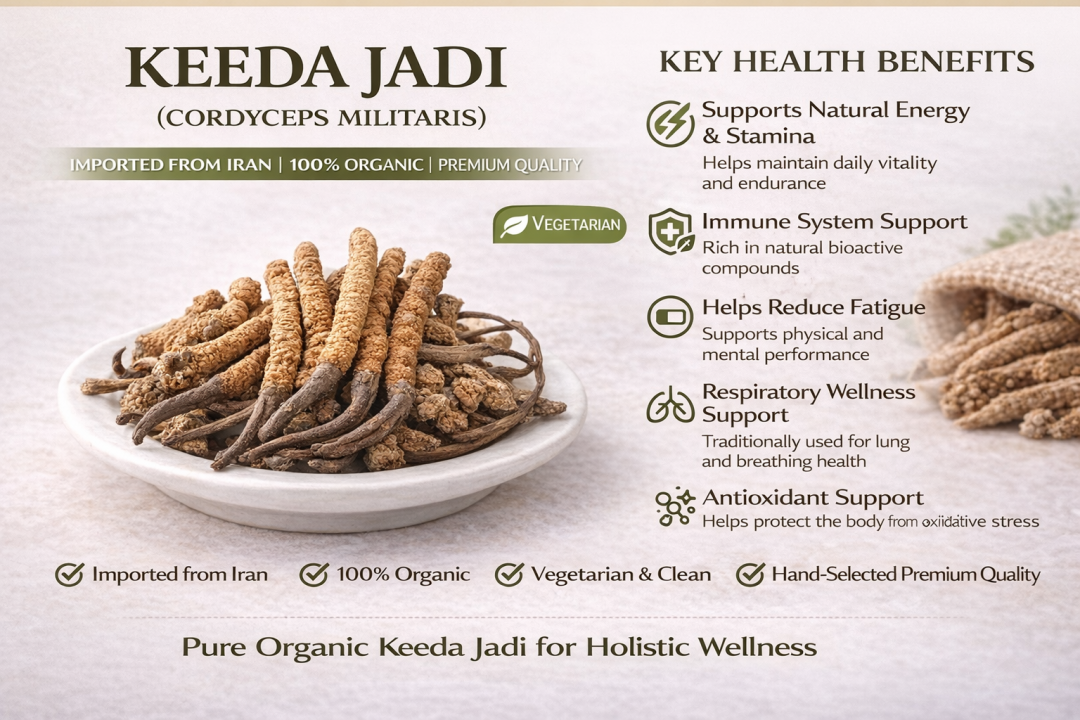 Keeda Jadi (Cordyceps militaris) is a traditionally valued herbal ingredient known for its role in supporting energy, endurance, and overall wellness. Our Keeda Jadi is imported from Iran, organically processed, and carefully packed to preserve its natural potency.