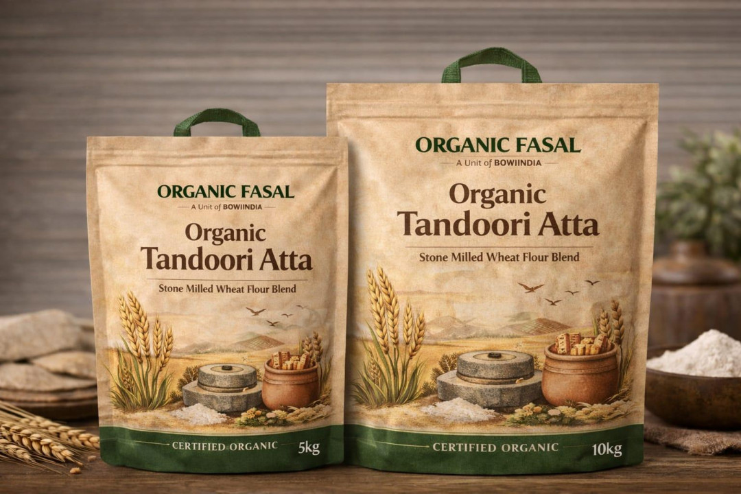 Organic Fasal Organic Tandoori Atta is a specially crafted stone-milled wheat flour blend developed for authentic tandoori cooking. Made from organically grown wheat and processed without chemical bleaching, it delivers excellent dough elasticity and consistent performance for high-heat applications. Ideal for preparing tandoor roti, naan, kulcha, and other traditional flatbreads, this atta performs reliably in tandoors, clay ovens, and commercial kitchens. Available in convenient 5 kg and 10 kg bulk packs, it is suitable for households, restaurants, dhabas, and HoReCa use. Organic Fasal is a unit of BOWIINDIA.