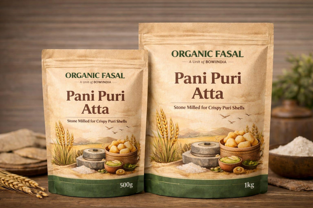 Organic Fasal Special Pani Puri Atta is a purpose-crafted flour blend developed to deliver crispy, well-puffed pani puri shells with consistent results. Stone milled using traditional techniques, this atta provides the ideal grain balance and binding strength required for smooth rolling, even frying, and long-lasting crispness. Free from chemical bleaching, it retains a clean, natural texture suitable for authentic Indian street-food preparation. Whether you are preparing pani puri for family gatherings, festive occasions, or professional street-food service, Organic Fasal Special Pani Puri Atta ensures dependable performance and classic taste—batch after batch. Organic Fasal is a unit of BOWIINDIA, committed to thoughtfully processed, high-quality food products designed for both modern kitchens and traditional Indian recipes.