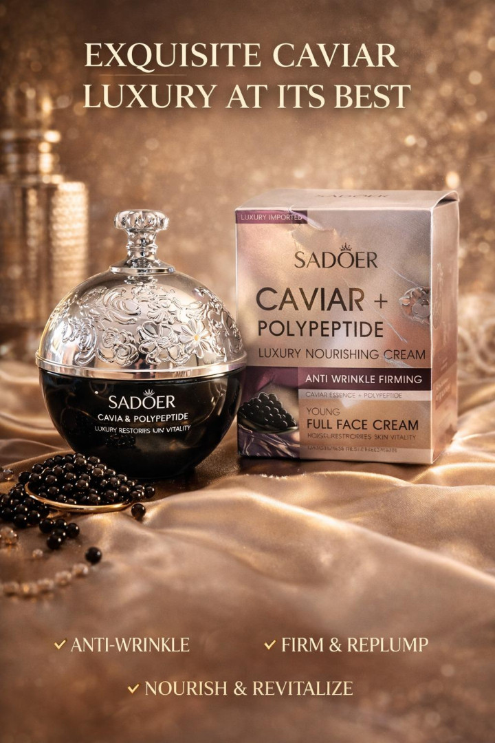 Elevate your skincare ritual with SADOER Caviar + Polypeptide Luxury Nourishing Face Cream, an advanced imported formulation created to visibly firm, smooth, and rejuvenate the skin. Enriched with precious caviar essence and skin-repairing polypeptides, this high-performance cream delivers intense nourishment while supporting elasticity, moisture balance, and youthful vitality. Its rich yet velvety texture melts seamlessly into the skin, working to improve skin smoothness, reduce the appearance of fine lines, and enhance overall radiance. With regular use, skin feels deeply nourished, looks firmer, and appears more supple and luminous. Presented in a beautifully crafted jar with an ornate silver lid, SADOER represents sophistication, indulgence, and luxury skincare excellence.